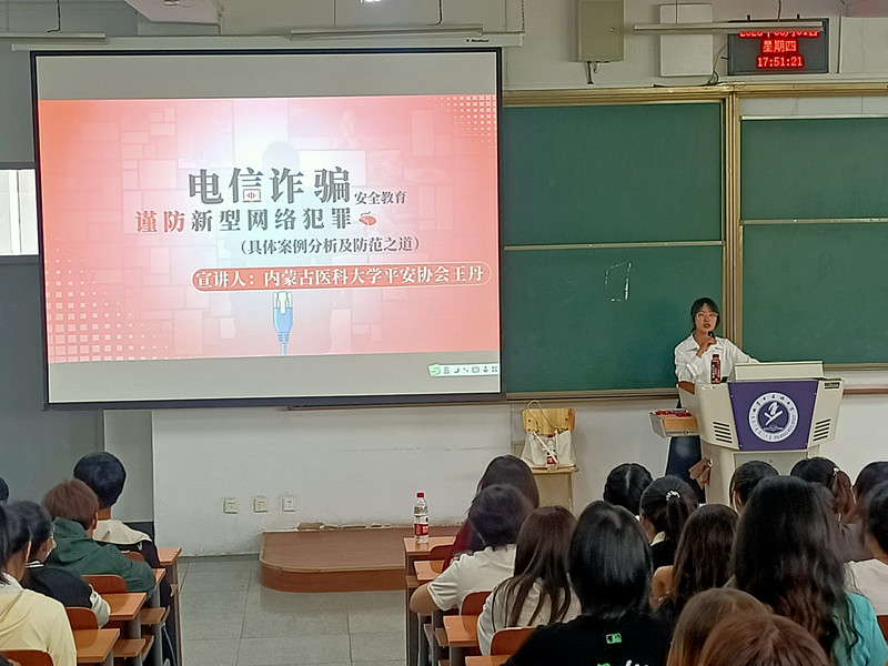 5月29日,反电诈课堂正式开讲。安全管理部青格乐副部长通过学校发生的案例,提醒学生要加强反电诈知识的学习,强调防范电信网络诈骗不是一句口号,要真正做到入脑、入心、入行。随后“平安校园”协会4名主讲人通过案例向同学们阐述了各类新型诈骗类型,科普了生活中常见的诈骗陷阱及应对方法,告诫同学们要保持警惕,不要随意泄露身份证件、银行卡等重要信息,不转账、不轻信、不涉密、不链接,遇见诈骗信息时要保持镇静,切不可有侥幸与贪图利益的心理,筑起一道坚韧的心理防线。最后,“平安校园”协会主讲人通过视频的方式向学生们讲授了国家反诈中心app的安装及使用。