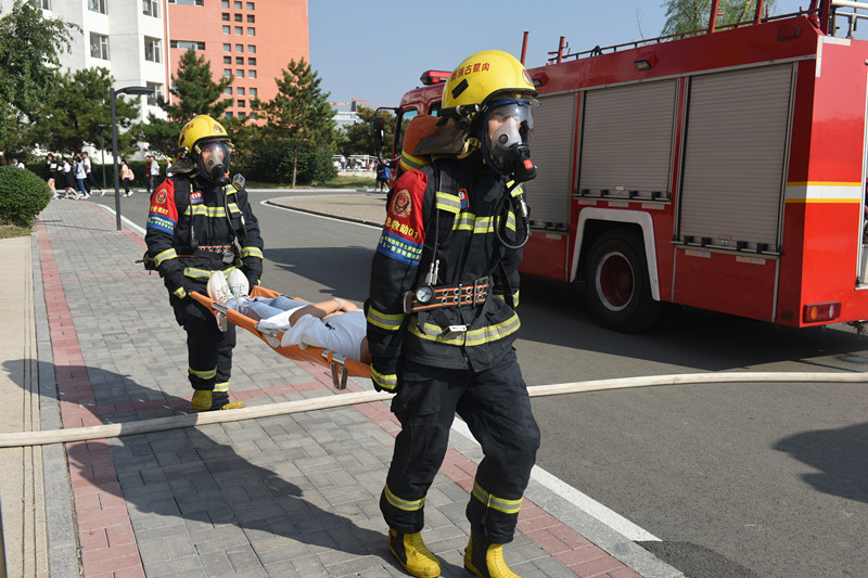15时,随着演习开始指令的发出,消防警报声响彻演习楼宇,消防疏散演习拉开帷幕。所有楼宇安保人员、生活指导老师严格按照消防疏散演习方案和火灾事故处置预案程序,迅速进行人员疏散和救援。参演学生服从指挥,行动迅速,撤离有序,分别向金山校区公寓广场指定位置集结。疏散演练结束后,消防队员对救援科目进行演练,使用二阶拉梯汉和绳索担架对营救被困同学进行救援,充分向同学们展示了火灾时遇到紧急情况的应对方法。