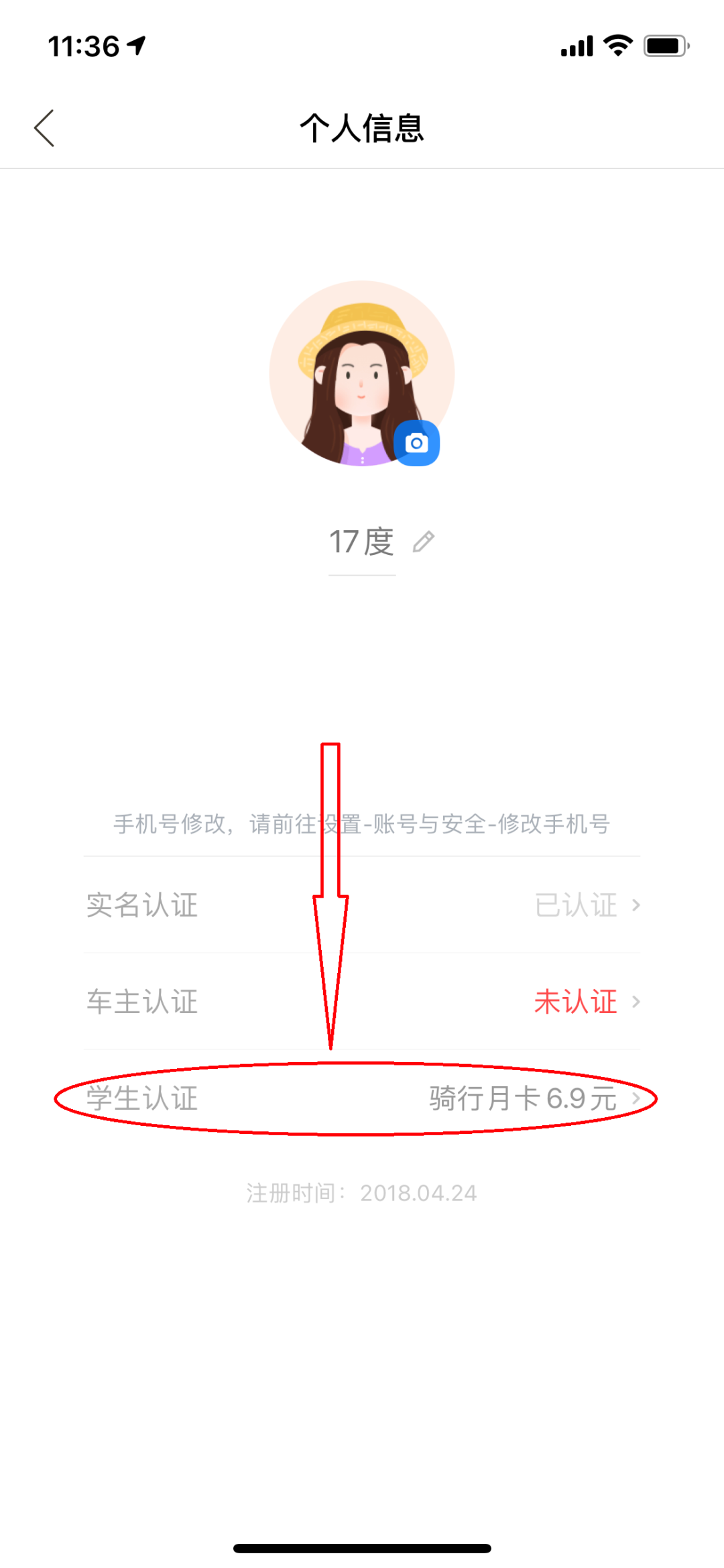 哈啰出行APP--我的--头像--学生认证--填入学生信息--认证成功--优惠骑车
