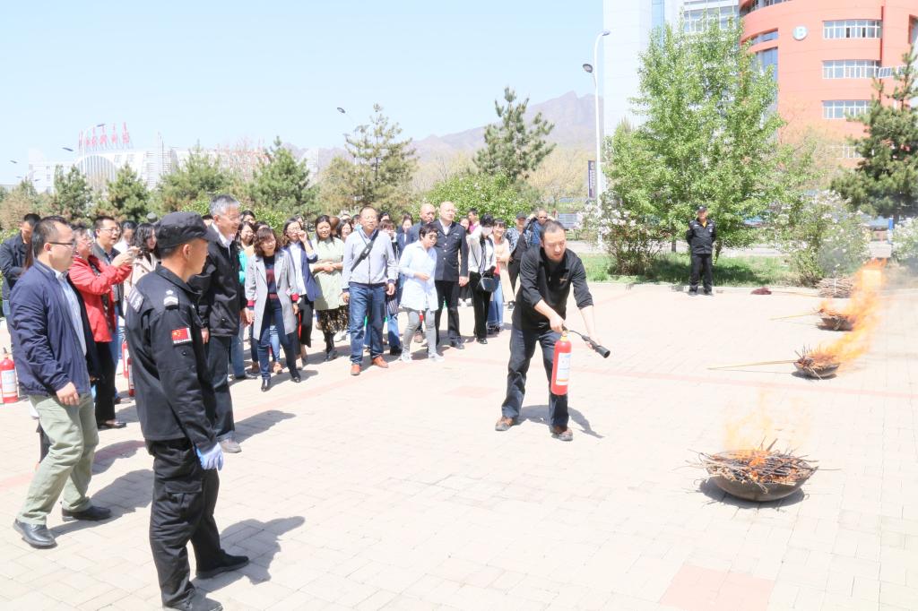 消防讲座结束后,全体人员在楼前广场进行灭火器实操演练,分别使用干粉灭火器、水基灭火器、二氧化碳灭火器进行了实际灭火演练。