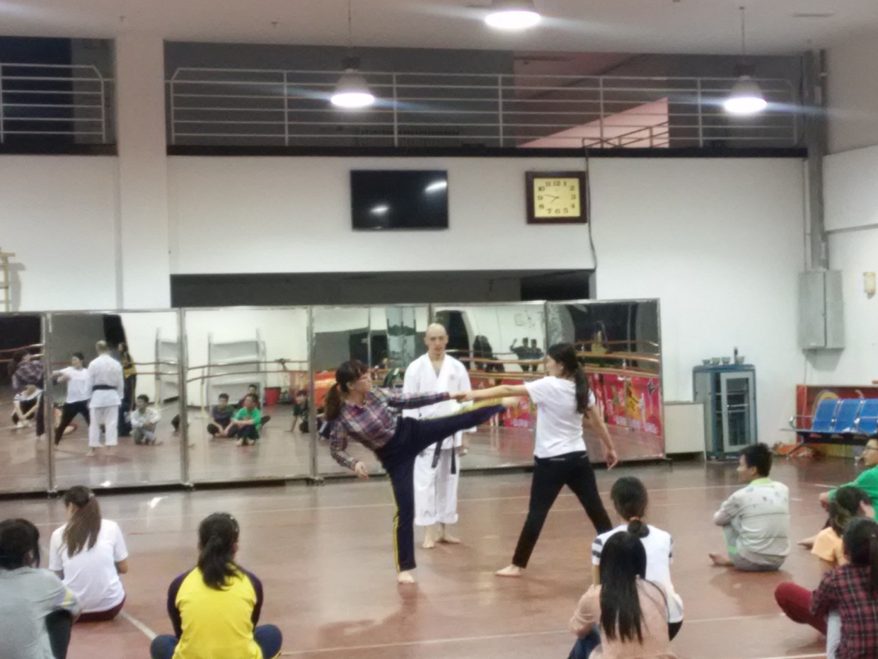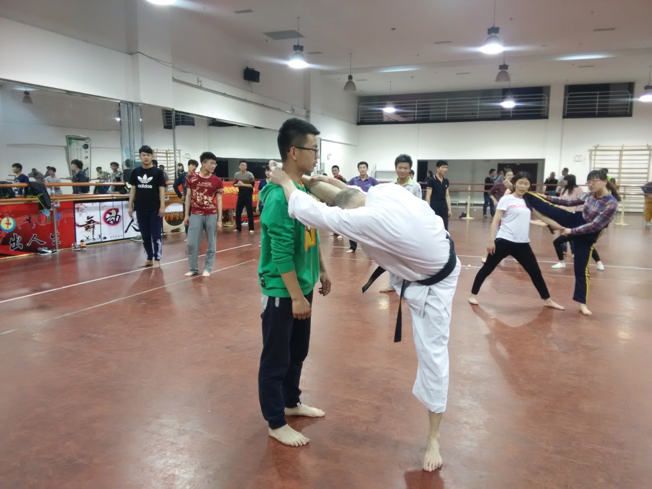 晚7点,来自欧洲的爱德华教练在一次为大家教授女子防身格斗培训,这一次区别于之前的讲解,多注重于实践,同学们两两一组,互帮互助进行练习。