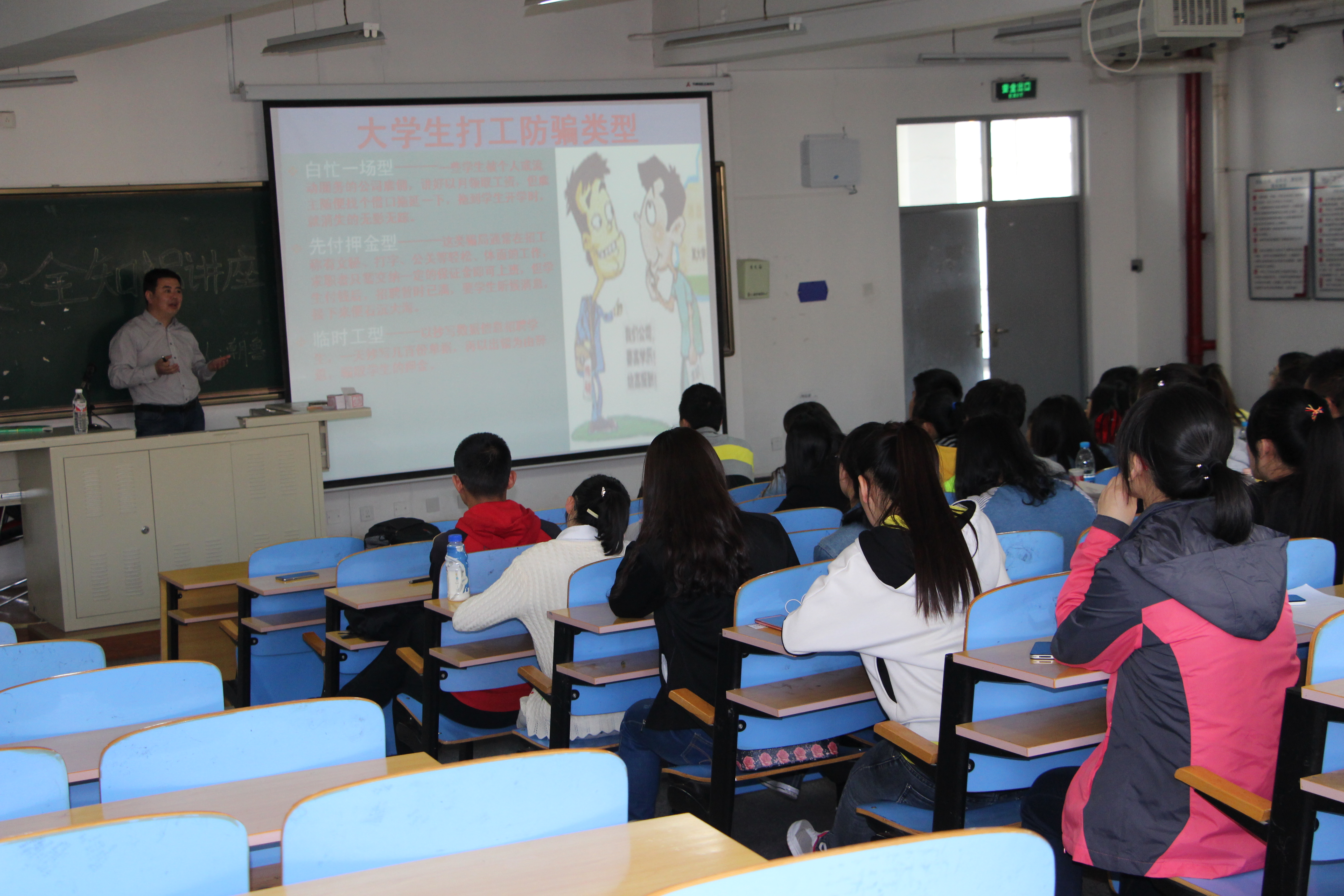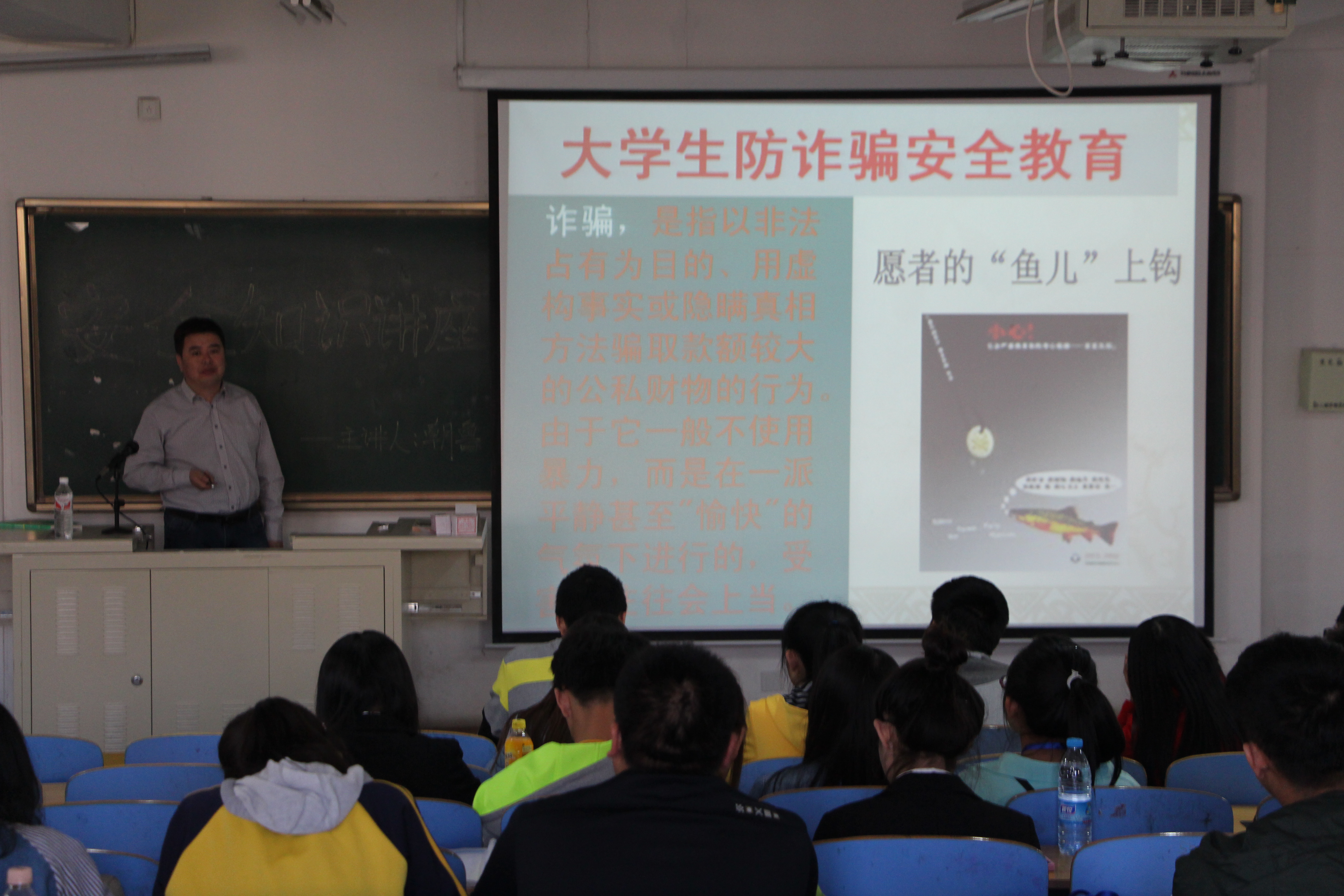 校保卫处朝鲁老师担任主讲人,为同学们讲解了诈骗隐患,预防方法,列举身边发生的典型事例,详细讲解了有关于防诈骗的安全知识,用十分幽默易懂的方法进行授课,并与同学们进行了互动。