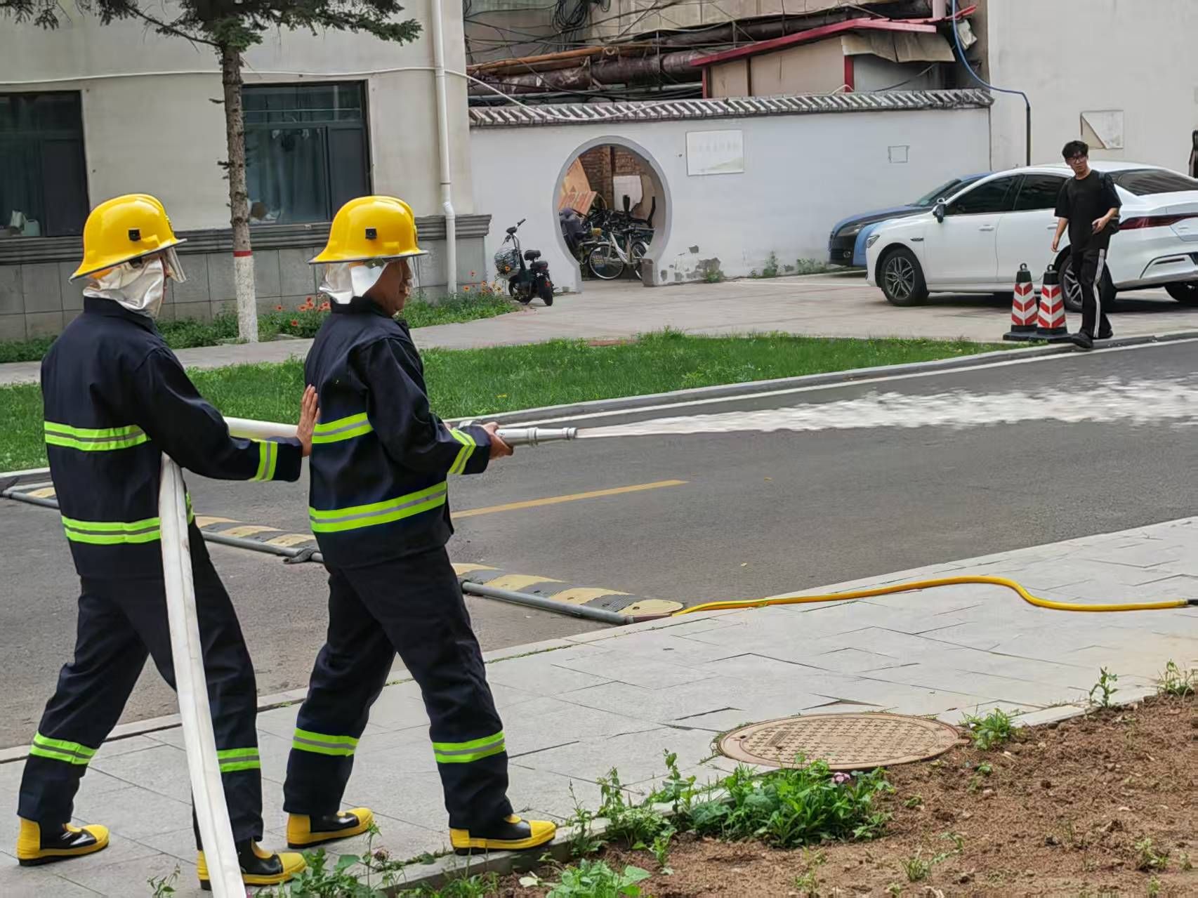 在反恐防暴演练结束后,组织开展了消防应急演练活动。